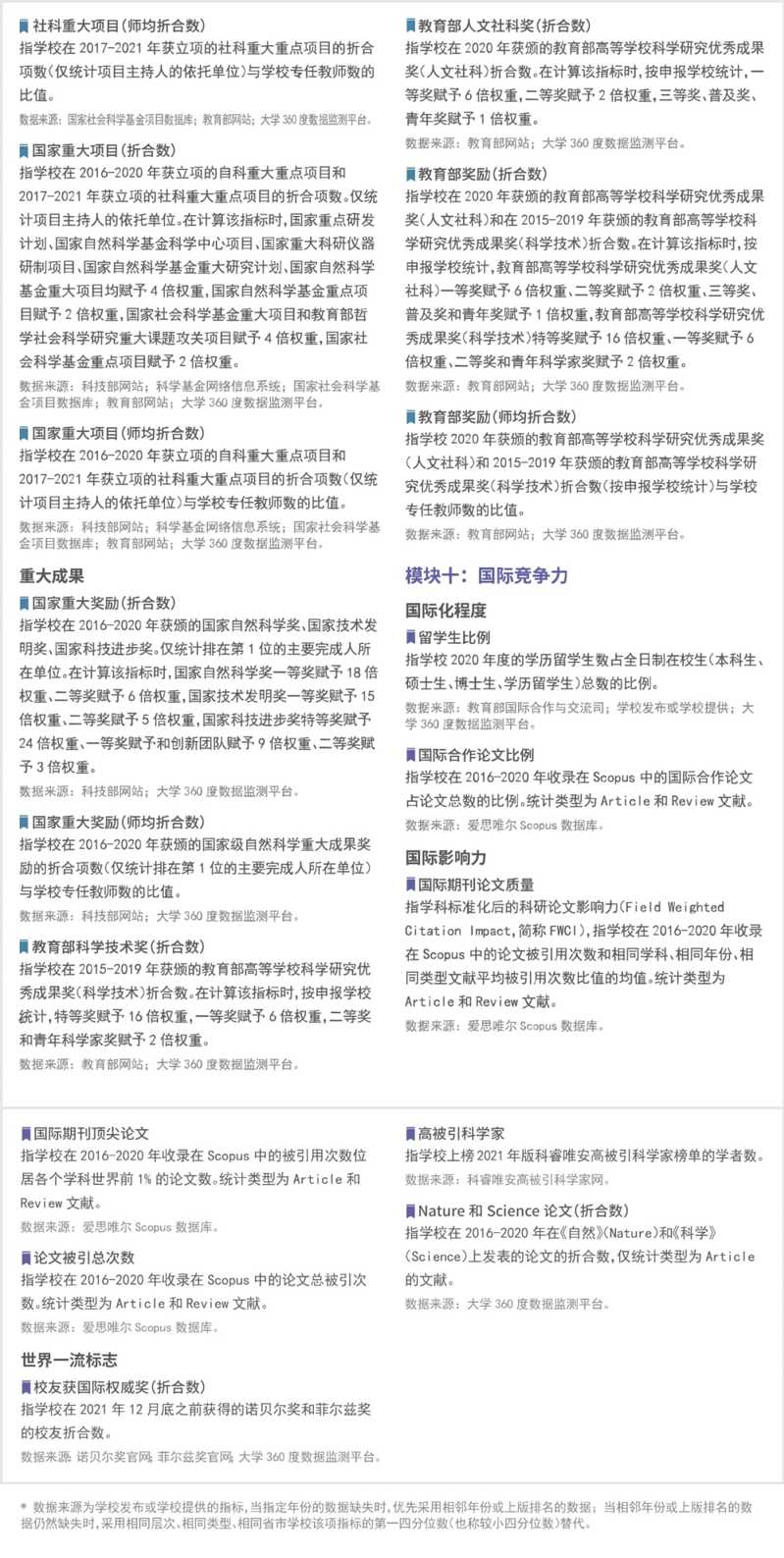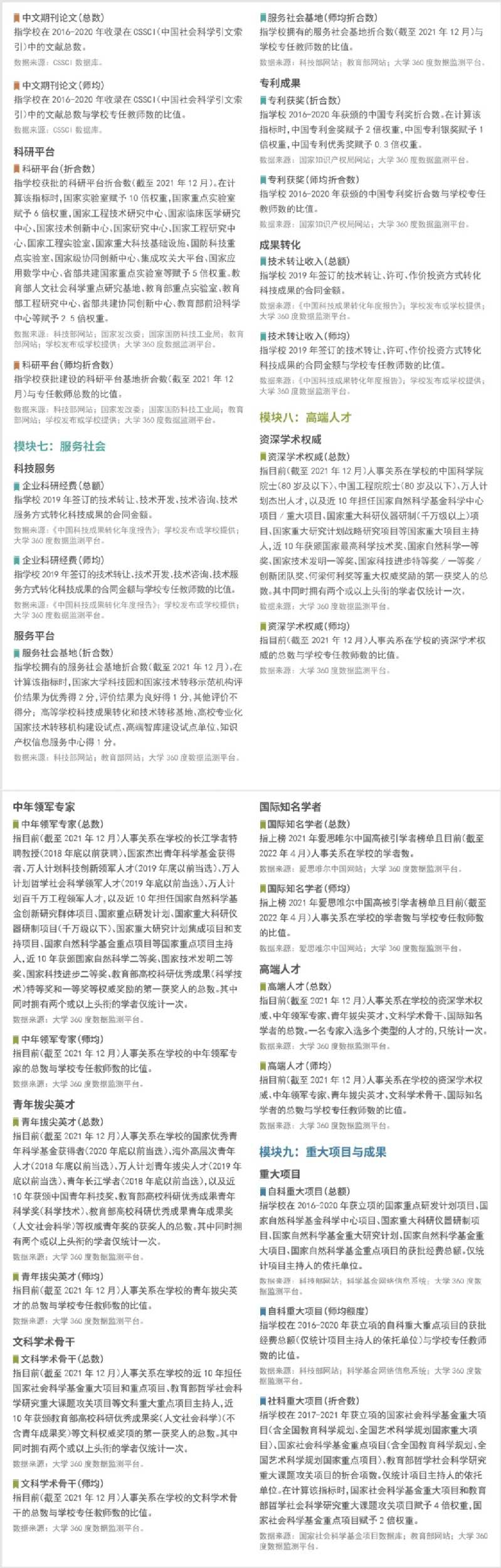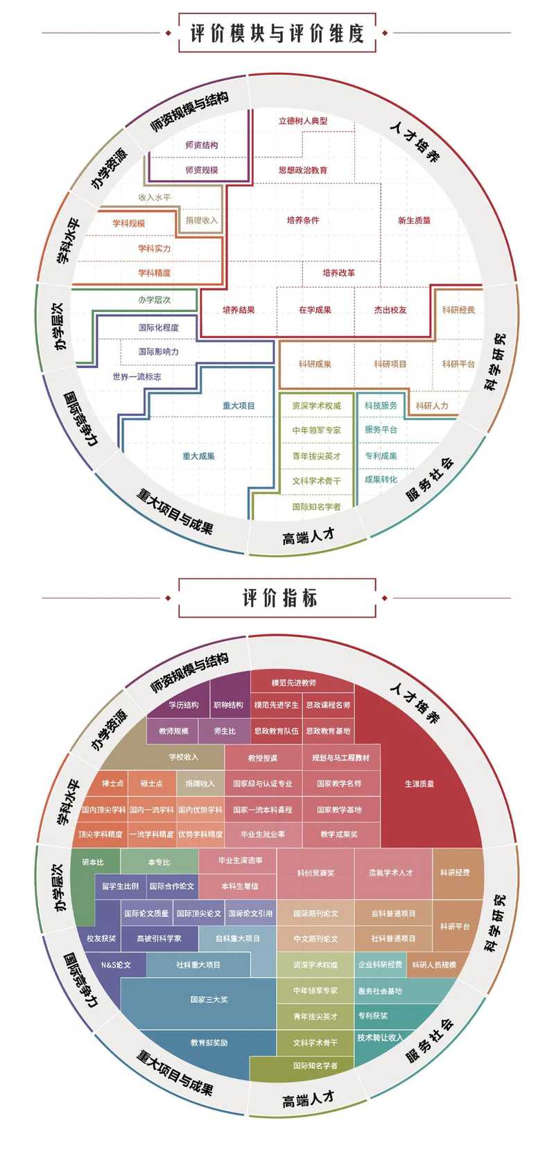 “软科中国大学排名”的评价体系源自自主研发的可视化评价专利技术,依托“大学360度数据监测平台”的大数据支持,设置办学层次、学科水平、办学资源、师资规模与结构、人才培养、科学研究、服务社会、高端人才、重大项目与成果、国际竞争力共十个评价模块,细分36个评价维度,内嵌104项评价指标,涉及320个评价变量,是对中国大学办学水平的立体化监测式评价。