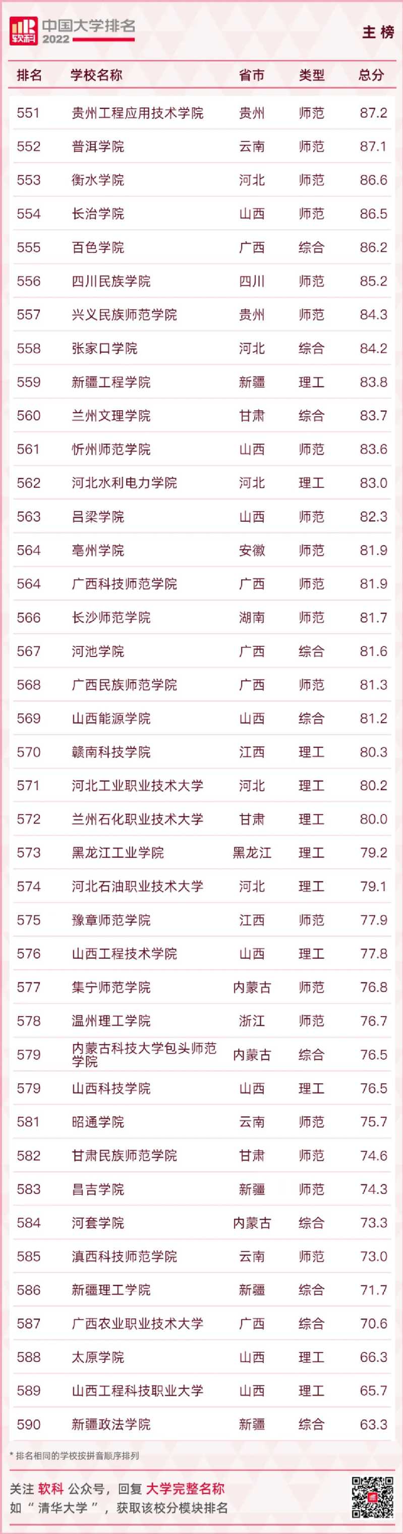 下表为综合性大学排名、6个单科性大学和合作办学大学的全国参考排名总榜单。