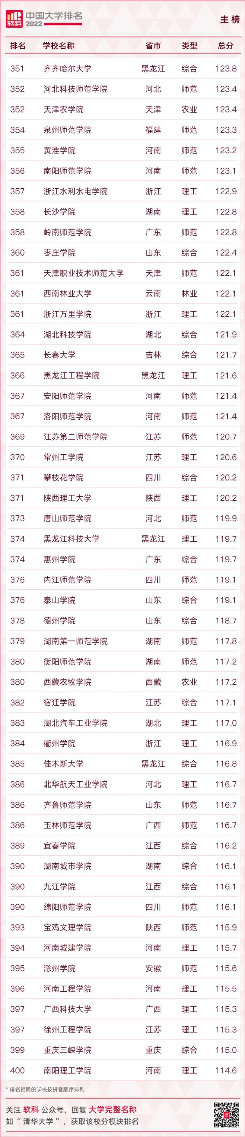 2022年4月19日,高等教育专业评价机构软科正式发布“2022软科中国大学排名”。清华大学、北京大学、浙江大学蝉联主榜(即综合性大学排名)前三位。北京协和医学院位列医药类大学排名第一,上海财经大学位居财经类大学排名榜首,北京外国语大学名列语言类大学排名第一,中国政法大学位列政法类大学排名榜首,中央民族大学占据民族类大学排名首位,上海体育学院领跑体育类大学排名,香港中文大学(深圳)在中国合作办学大学排名中夺冠。