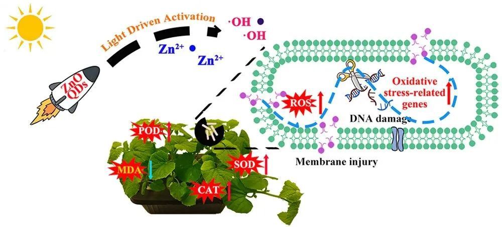 瓜类细菌性果斑病是瓜类生产地区严重性的病害,杨德松团队通过合成氧化锌量子点研究其对瓜类果斑病的控制作用,研究发现氧化锌量子点在可见光驱动下比黑暗条件下防病效果提高了1.8倍,发病率降低了32%,同时氧化锌量子点通过激活植物氧化防御系统,促进了感病植株幼苗的生长作用,该项研究为瓜类病害防治提供了新思路。